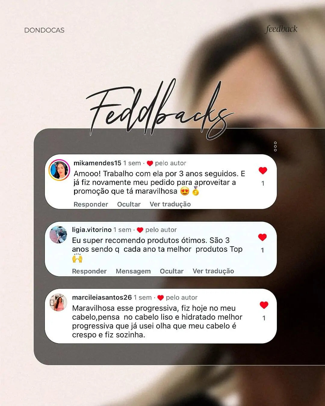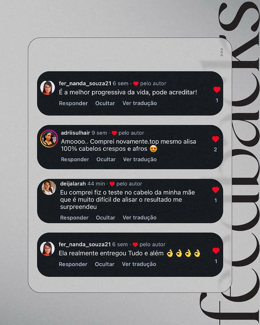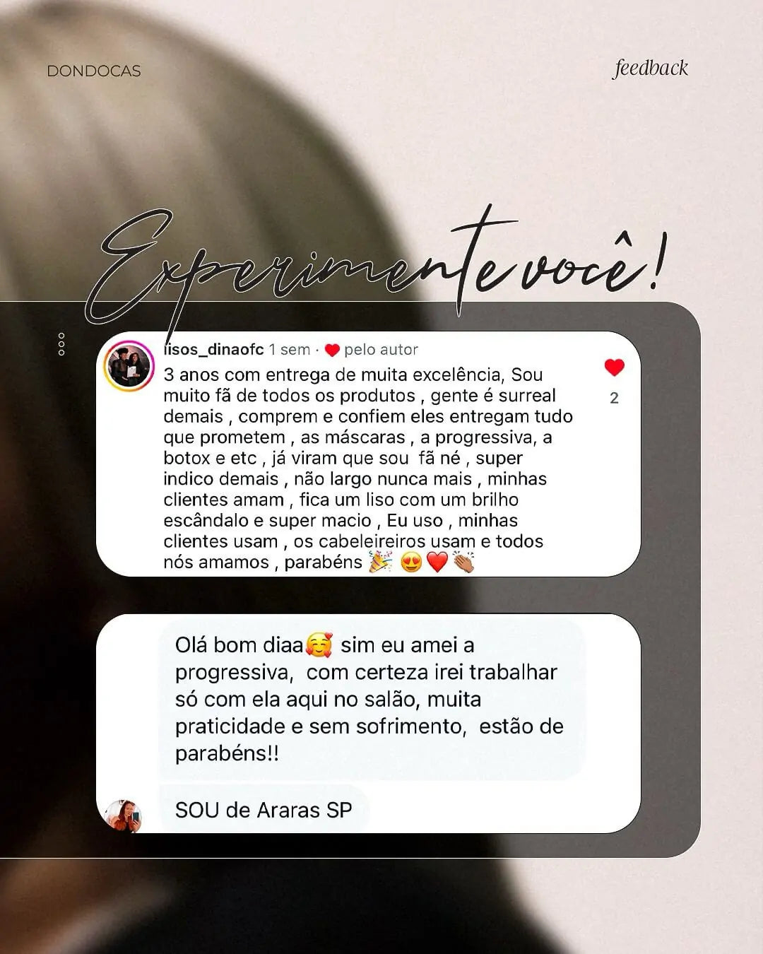 Atendimento eficiente e envio dos produtos muito rápido e bem embalado, e pra completar o resultado nota 1000000 com essa progressiva maravilhosa, com certeza irei comprar várias vezes na loja! Fernanda Barreto da Silva -