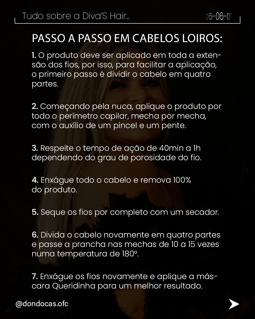 Sem formol • Alisa 100% desde a primeira Aplicação • Sem ardência • Cheiro Suave. Compatível com loiras.